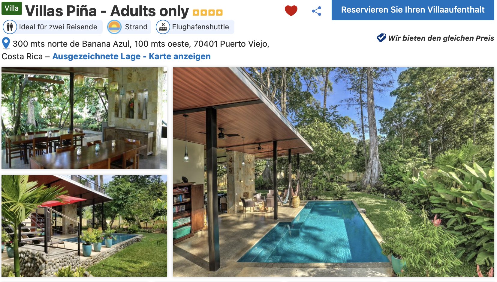 Leider hatten wir im Strandhaus in Cahuita nur eine Woche gebucht, da wir aber etwas länger auf der Karibikseite bleiben wollten, haben wir noch etwas in der Nähe von Puerto Viejo gebucht. Dem touristischen Trubel sind wir in den Villas Pina gut entkommen, denn die Anlage ist ca. 2km vor Puerto Viejo.