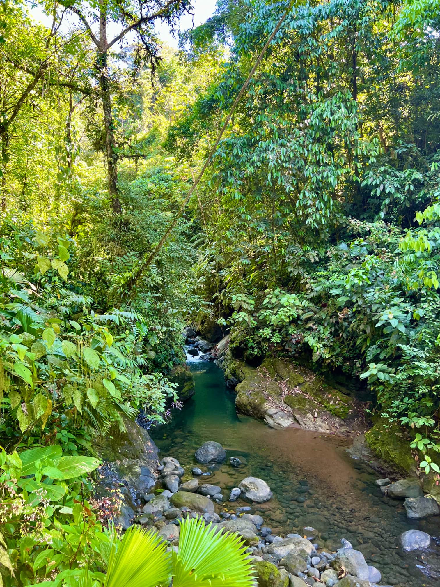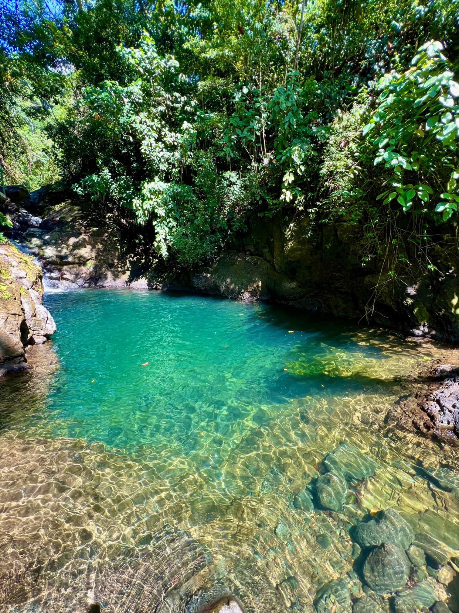 Zudem gibt es noch einen privaten Wanderweg am Haus. Er führt zuerst an einem Fluss entlang bevor es in den tiefen Dschungel geht. Dem Weg kann man aber gut folgen, da er mit gelben und blauen Pfeilen gekennzeichnet ist. Man kann einen Wasserfall bewundern, muss Flüsse überqueren und große Steine hinauf klettern. Bei uns ist kein Schuh trocken geblieben. Aber wir wurden mit einem wunderschönen, glasklaren Pool mitten im Dschungel belohnt. Es ist wirklich idyllisch und traumhaft schön und man hat keine Menschenmassen um sich.